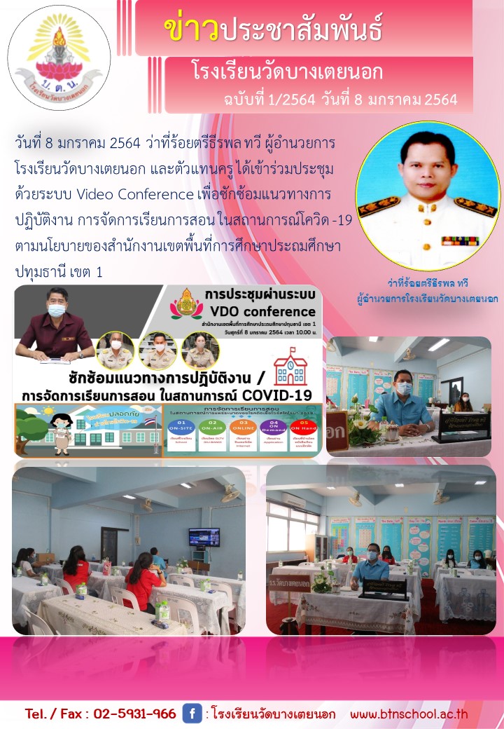 วันที่ 8 มกราคม 2564 ว่าที่ร้อยตรีธีรพล ทวี ผู้อำนวยการโรงเรียนวัดบางเตยนอก และตัวแทนครู ได้เข้าร่วมประชุม ด้วยระบบ Video Conference เพื่อซักซ้อมแนวทางการปฏิบัติงาน การจัดการเรียนการสอน ในสถานการณ์โคว